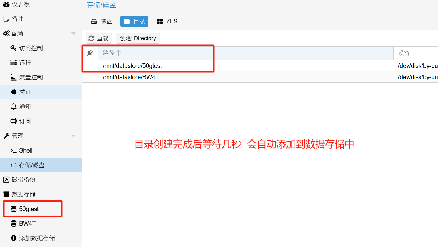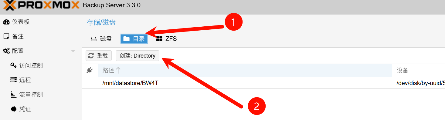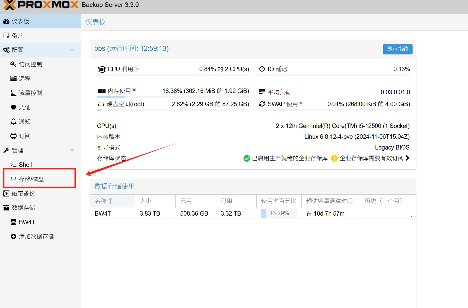 1、PBS安装完成后可以使用分配的IP:8007登入,PBS整体页面比较简单,首先我们需要添加存储池,点击管理→存储/磁盘。