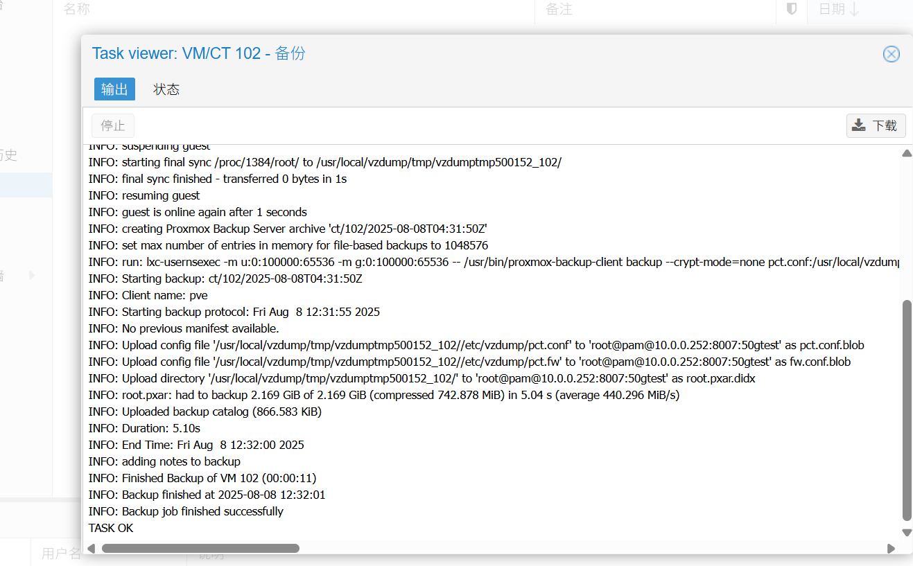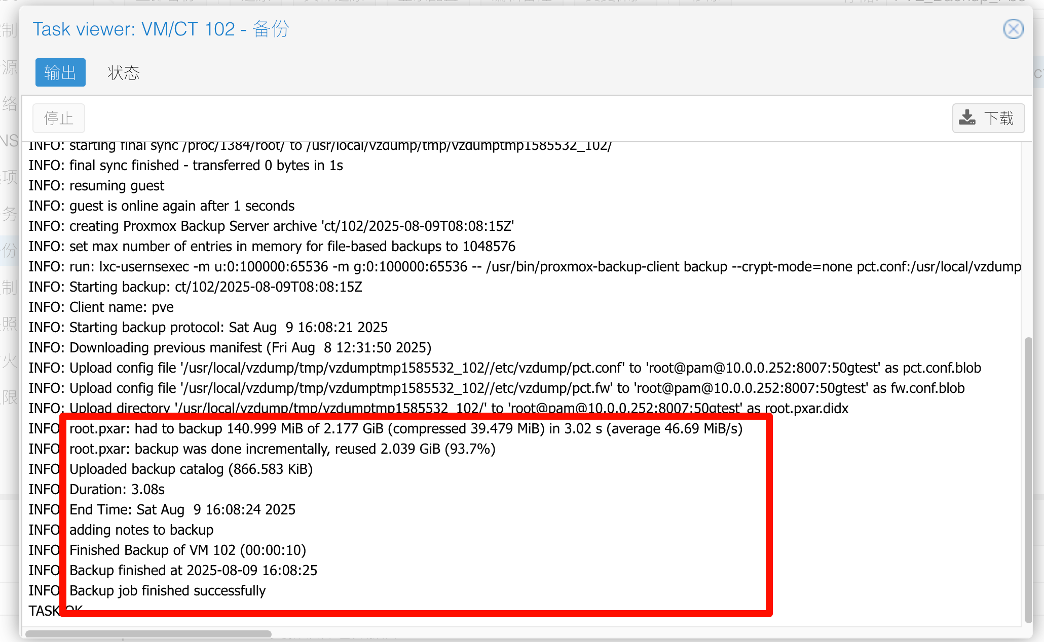 7、需要注意的是PBS第一次备份是完整备份,后续的备份都是增量备份,只会备份虚拟机新增|修改的内容,对比PVE自带备份的完整备份,可以大大节约宽带和备份时间。