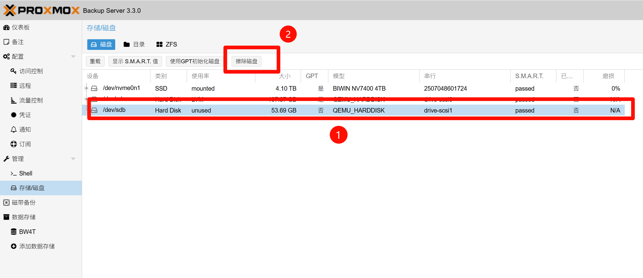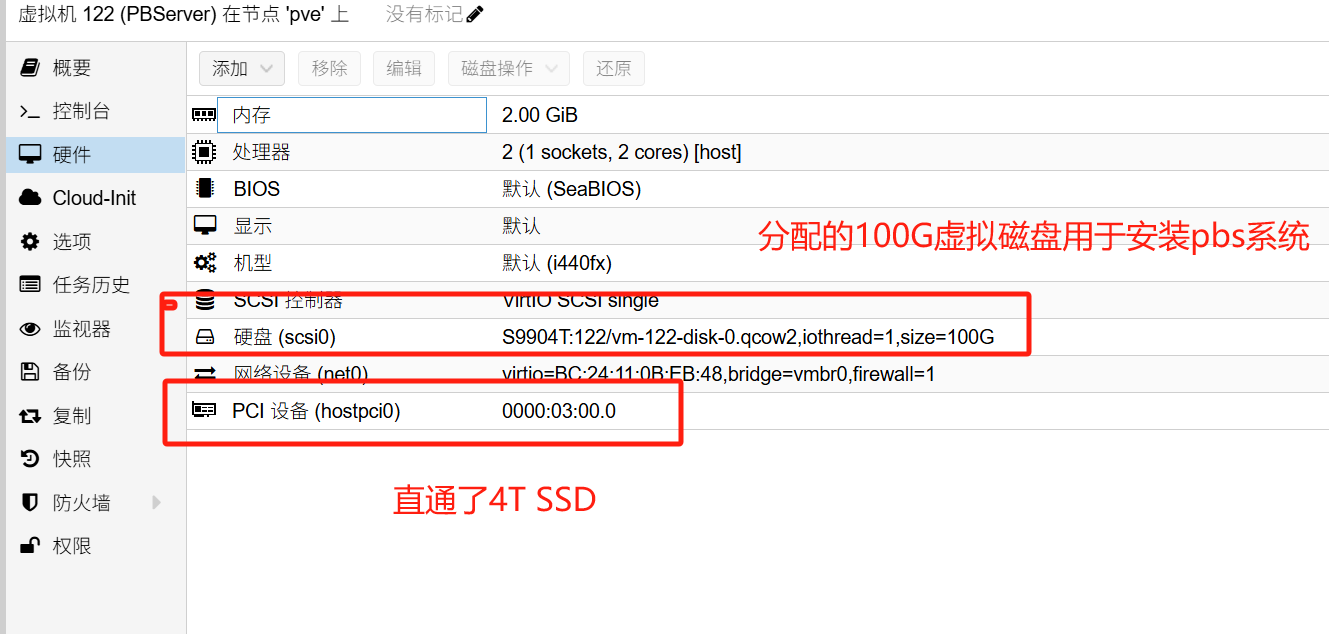 PSB本身对机器的配置需要不高,但是备份磁盘最好是本地磁盘,我这里采用的方式是直接在PVE虚拟机中部署PBS,并给其直通一块4T硬盘用于备份。