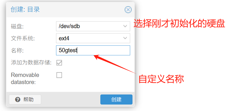 5、磁盘选择上面初始化的硬盘,文件系统选择ext4,名称自定义一个,然后点击创建。