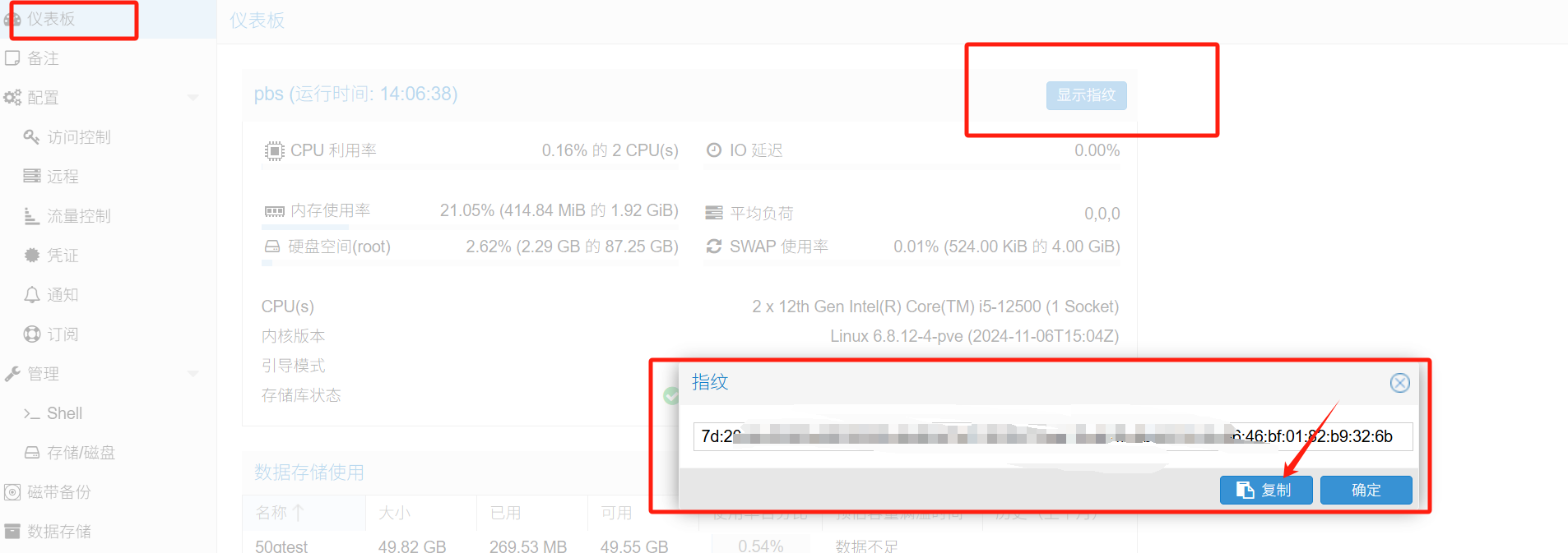 1、首先我们需要获取指纹认证ID,用来做连接认证,登录PBS,点击仪表盘➡️显示指纹,复制指纹。