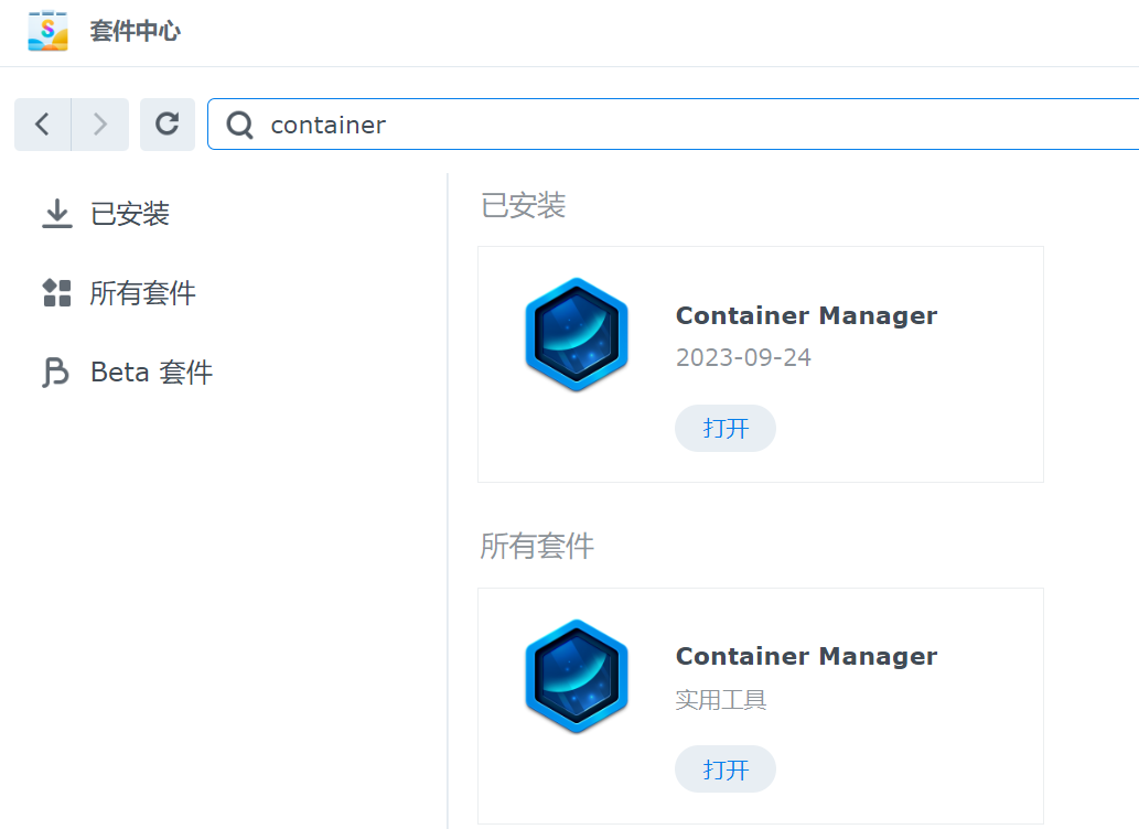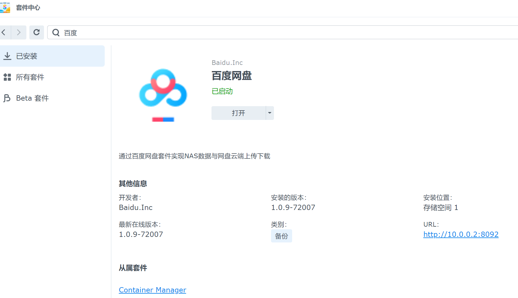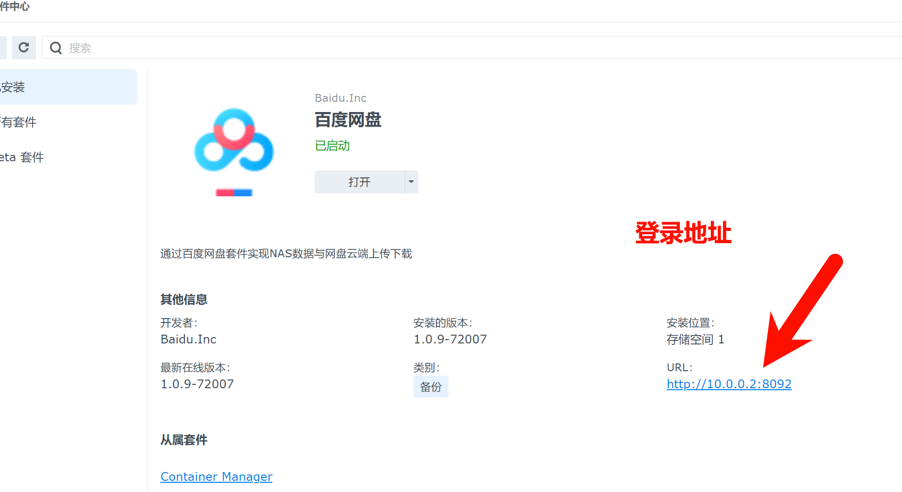 1、目前百度网盘套件是利用Docker容器来实现的,所以需要先安装Container Manage,直接套件中心搜索安装即可。