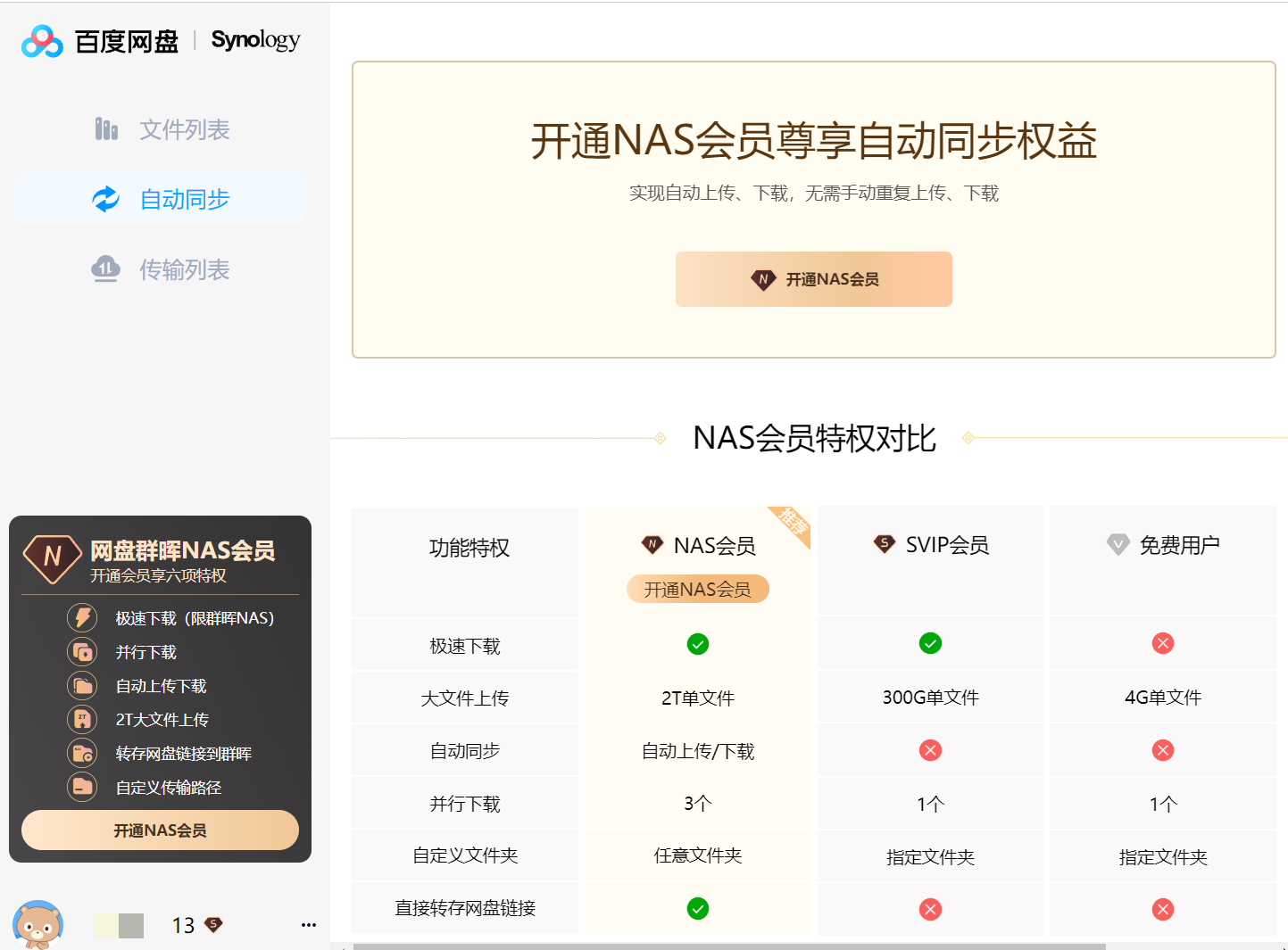 7、自动同步栏目因为我没有开通NAS专用会员所以无法使用,在下面的NAS会员特权对比中看到很多功能为NAS专用会员独享,百度网盘超级会员只能使用极速下载功能,以及最大上传文件上限为300G。