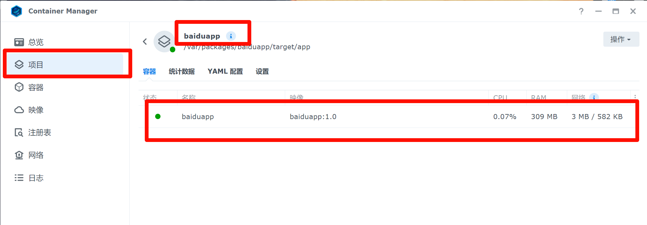 3、安装成功后会在Container Manage上生成一个名称为baiduapp的项目,内包含了一个容器,(之前有第三方开发者用百度云盘API开发的第三方套件也是使用了这种方式,但是那个套件包含了4个容器)