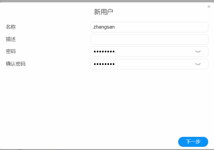 1、新建用户:点击用户,”+“号,输入用户名和密码,点击下一步。