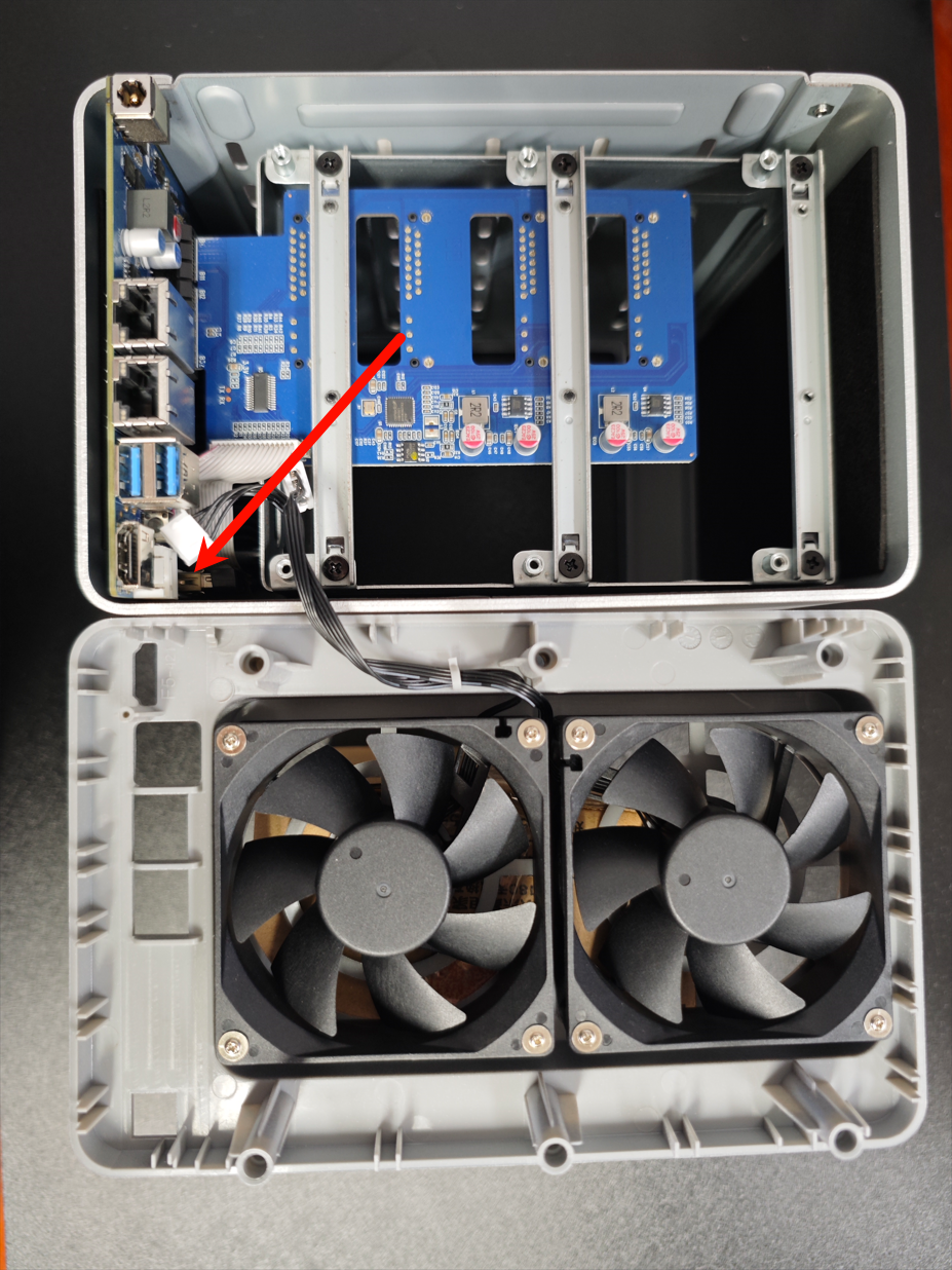 2、拔下风扇排线,轻轻向上抽出NAS外壳,即可看到NAS主体结构。