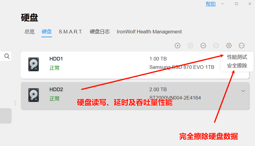 3、点击硬盘右侧更多可以看到硬盘测试和安全擦除功能。
