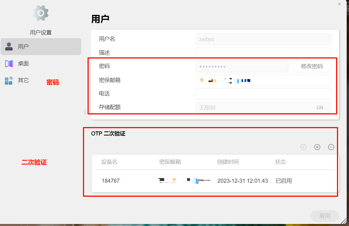 3、点击右上角的用户中心,可以对TNAS用户名、密码、邮箱进行快速更改,并且可以使用手机端设置OTP二次验证,这样在登录NAS的时候不仅需要输入密码,还需要输入实时更新的验证码,为NAS安全更增加一层保障。