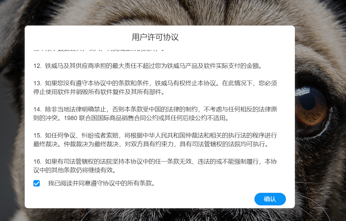 8,创建完成之后使用账号登录,勾选用户许可协议点击确认。