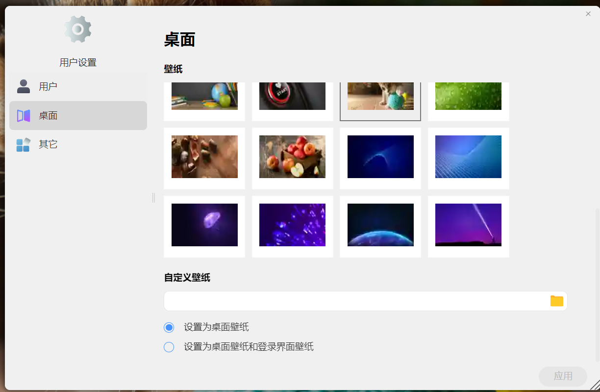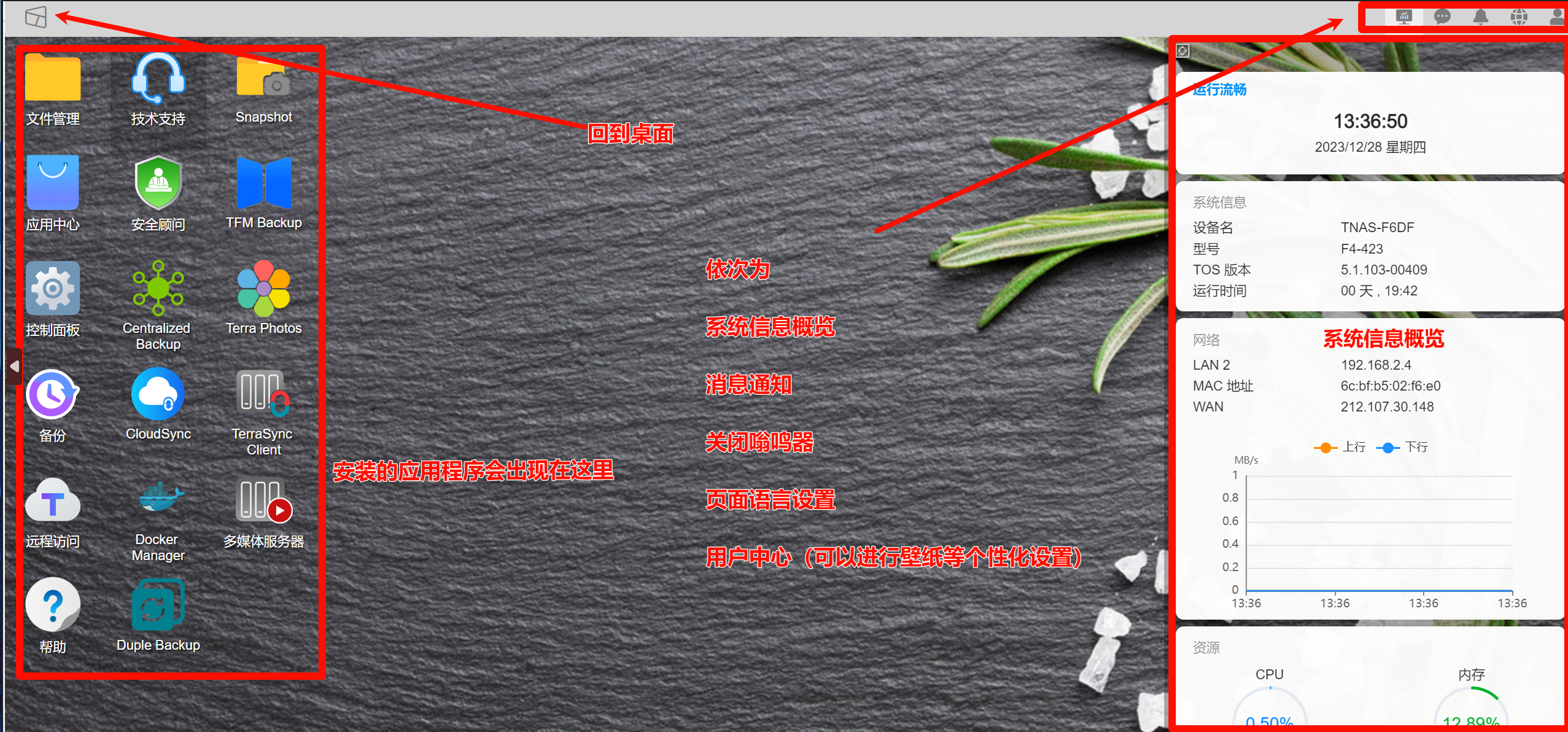1、TNAS安装好的应用会以图表的方式出现在桌面上,没有二级菜单。左上角为回到桌面,右上角的快捷键功能依次为系统概览信息、消息通知、关闭嗡鸣器、页面语言设置、用户中心(可以进行壁纸等个性化设置)。
