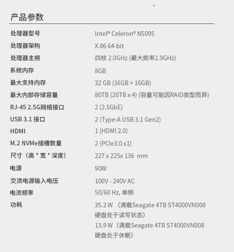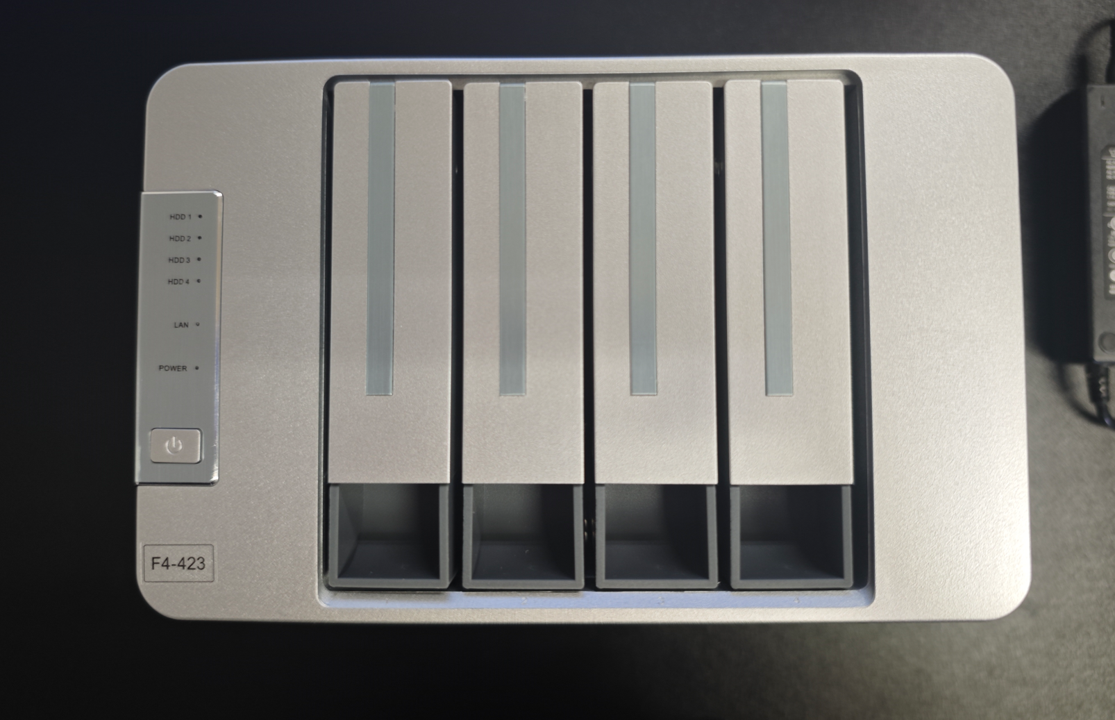 4、F4-423是一款四盘位的NAS,硬盘指示灯、网线指示灯等都被集中在了左侧区域,下方为机器的开机按键,前面板无其他接口。