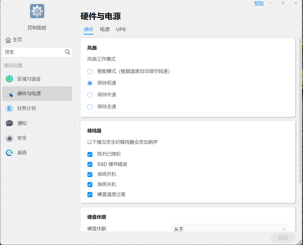 1、通用设置中在硬件与电源中可以对风扇的工作模式、嗡鸣器进行设置,以及硬盘是否休眠,对于24小时开机的NAS来说我建议关闭硬盘休眠。