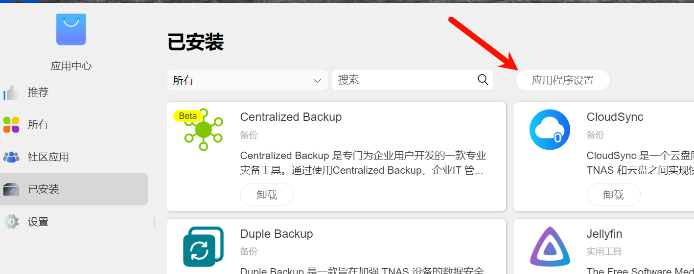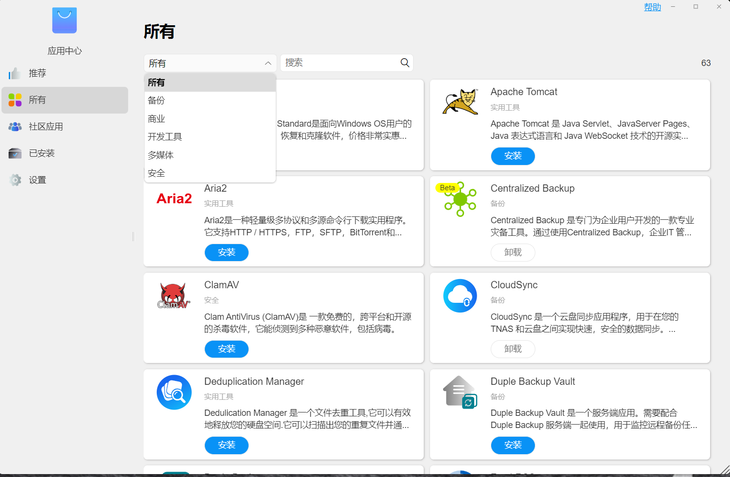 1、当我们需要拓展功能、安装应用的时候就会使用到应用中心了,目前截止到2023年12月28日应用中心总共有63款软件,涵盖了备份、商业、开发工具、多媒体、安全几大类,应用生态还是非常丰富的。