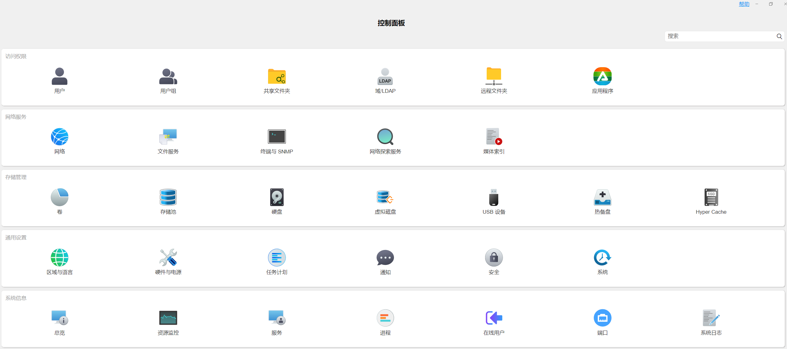 TNAS控制面板按照设置类别分成5大块,访问权限、网络服务、存储管理、通用设置、系统信息,因为设置选项过于多,为了不给刚接触NAS的新手造成困扰,这里我将介绍一些常用应用,对于默认开启或者进阶的设置将跳过。