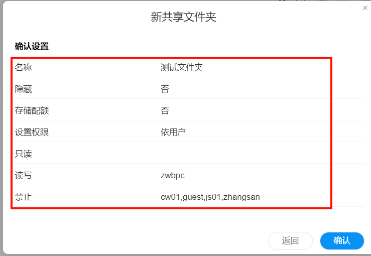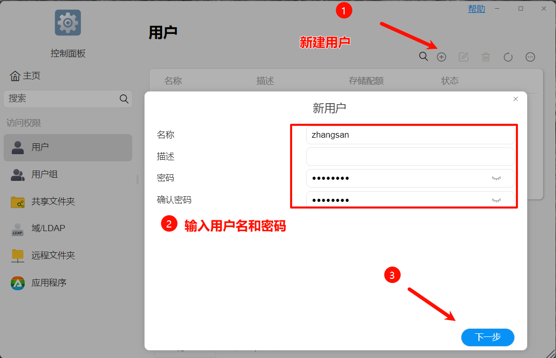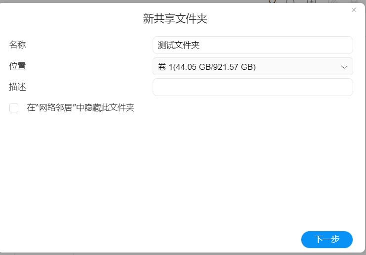 4、在文件管理中我们只能建立二级目录,主目录需要在共享文件夹中创建,点击共享文件夹➡”+“号,输入文件夹名称,选择存储位置,然后点击下一步。