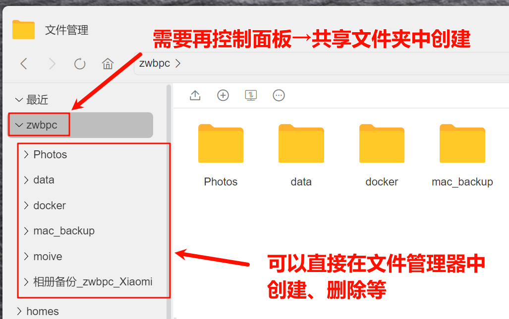 2、默认的根目录需要在控制面板→共享文件夹中创建,子目录可以直接在文件管理器中操作。
