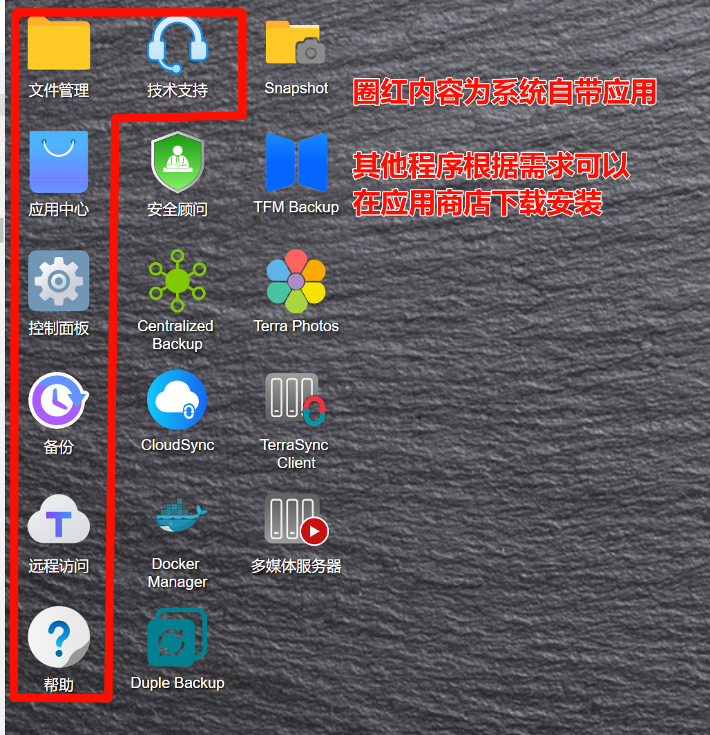 2、TNAS的内置程序只有以下几款,其他应用都是以软件的方式集成在应用商店中,这样做的好处是是系统更加精简,用户有啥需求在应用商店中搜索下载即可。