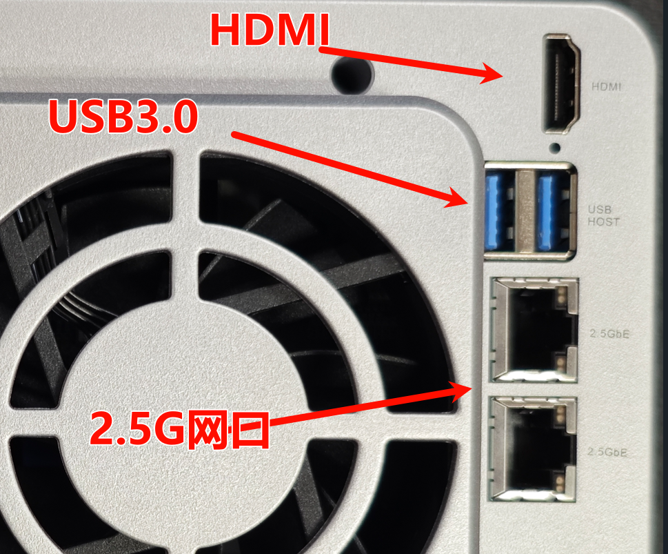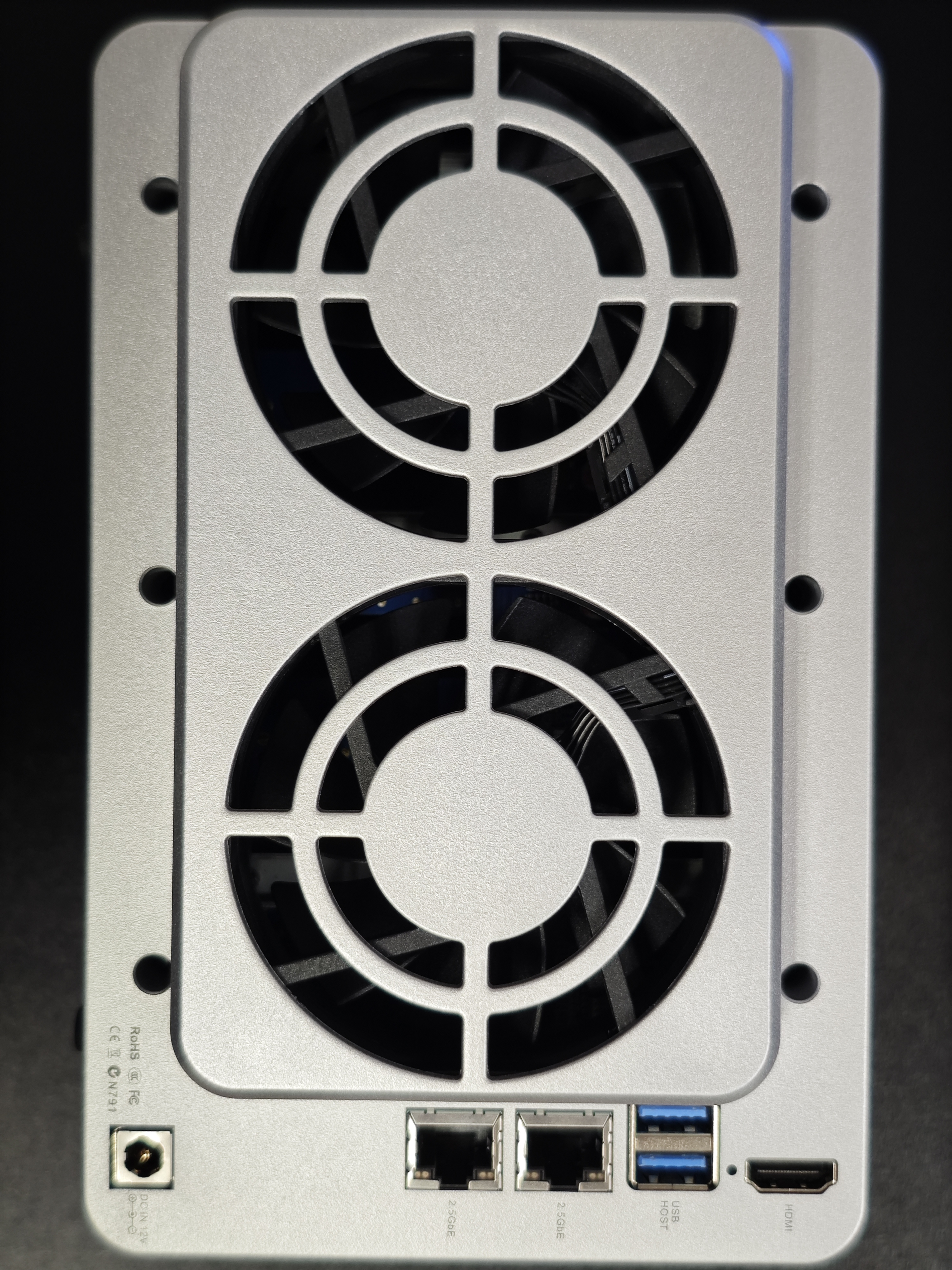 6、铁威马的后置两个风扇是突起的,并不是和机箱背面齐平,突起地方内置了两个8CM风扇,支持风扇智能调速,右侧为IO接口部分。