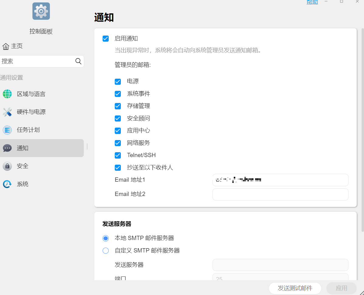 2、在通知中配置一个邮箱,当TNAS遇到异常时,系统会自动向系统管理员发送邮件通知,默认使用的是铁威马的邮箱,支持自定义SMTP邮件服务器。