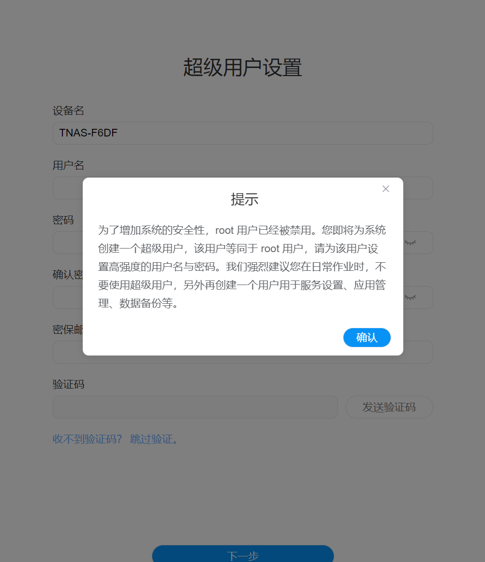 7、当重启完成之后再次听到哔声后再次刷新网页,出现如下页面表示系统已经安装成功,为了安全考虑,系统已经禁用了root用户,但是系统会要求创建一个等同于root权限的超级管理员,按照要求创建即可。
