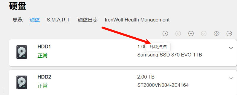 1、在系统安装和初始化的时候已经使用到了存储管理,这里说几个比较好用的功能,在硬盘管理中可以直接扫描硬盘快坏。