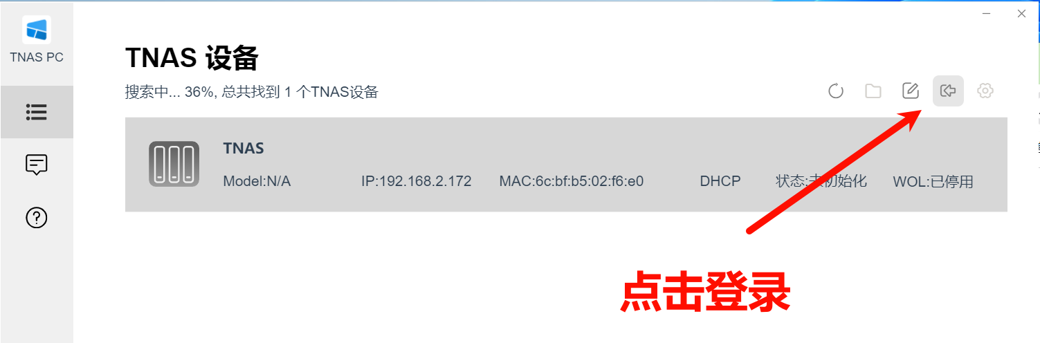 2、将TNAS安装上硬盘,接好网线、电源,然后按开机按键,稍等1分钟左右会有滴滴提示音,然后打开安装好的TNAS PC,软件会自动检索局域网中的NAS设备,发现设备后点击右上角的登录按钮。