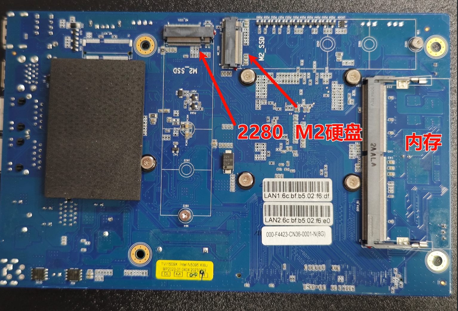 4、主板背面集成了两根2280规格的M2固态盘位,可以为NAS增加缓存盘提高读写速度,右边为一个DDR4内存插槽和前面板的插槽最大可支持32G内存。