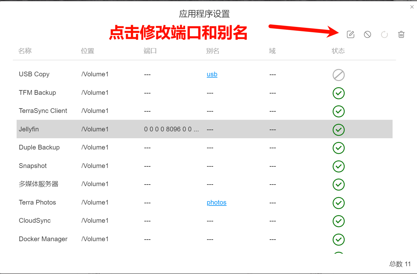 4、在已安装应用程序设置中可以查看应用程序外部访问别名和端口,并且可以自行修改。