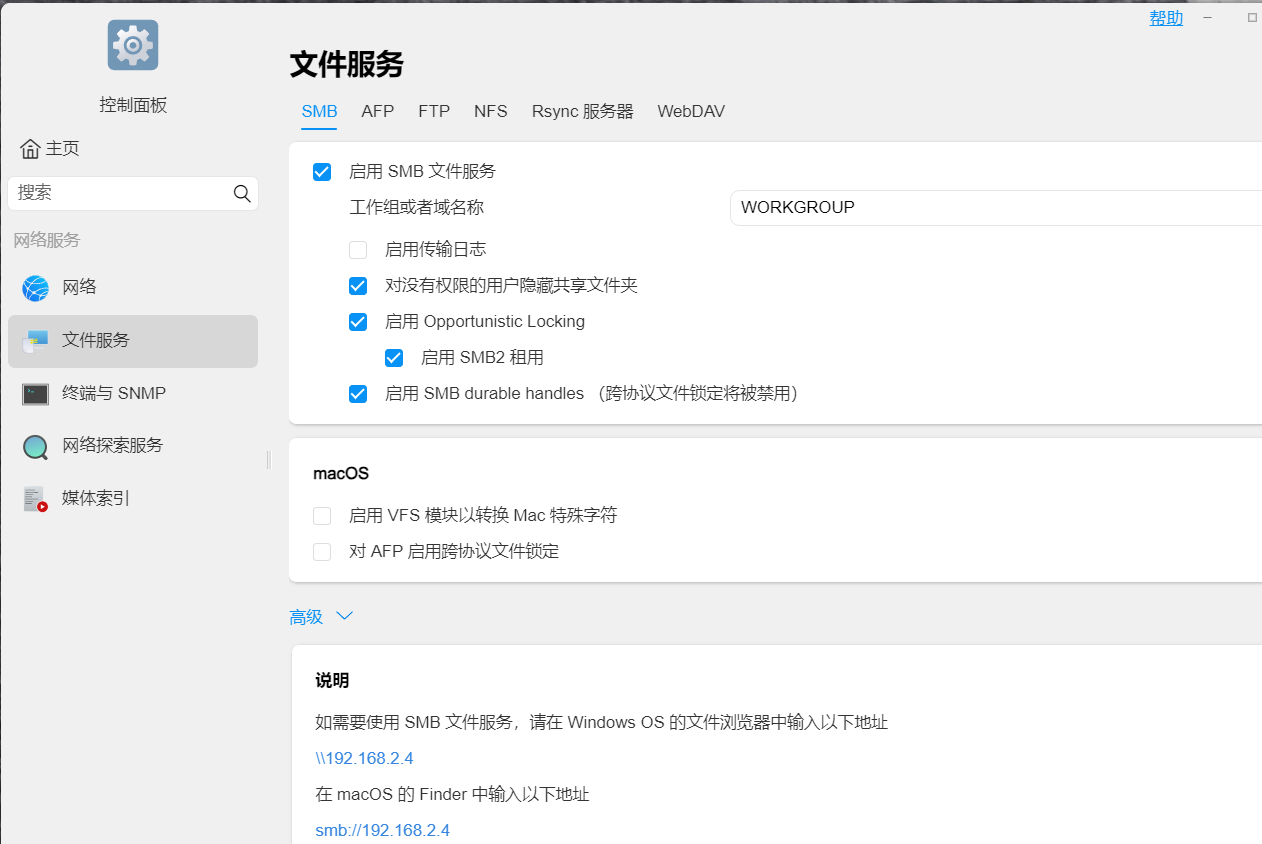 1、网络服务中除了网络配置外,TNAS支持SMB/AFP/NFS/FTP/SFTP/WebDAV等文件共享协议,开启选项也集成在了文件服务中,点击需要的协议勾选启用即可。