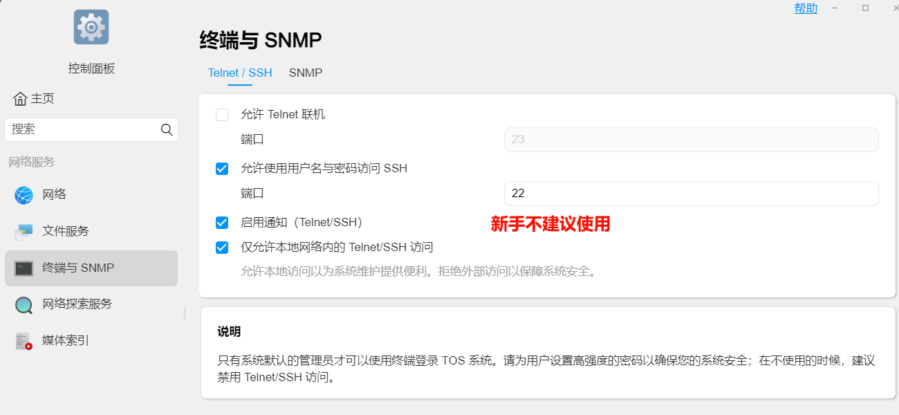 2、对于SSH远程连接也是支持的,为了NAS稳定性不建议新手使用。
