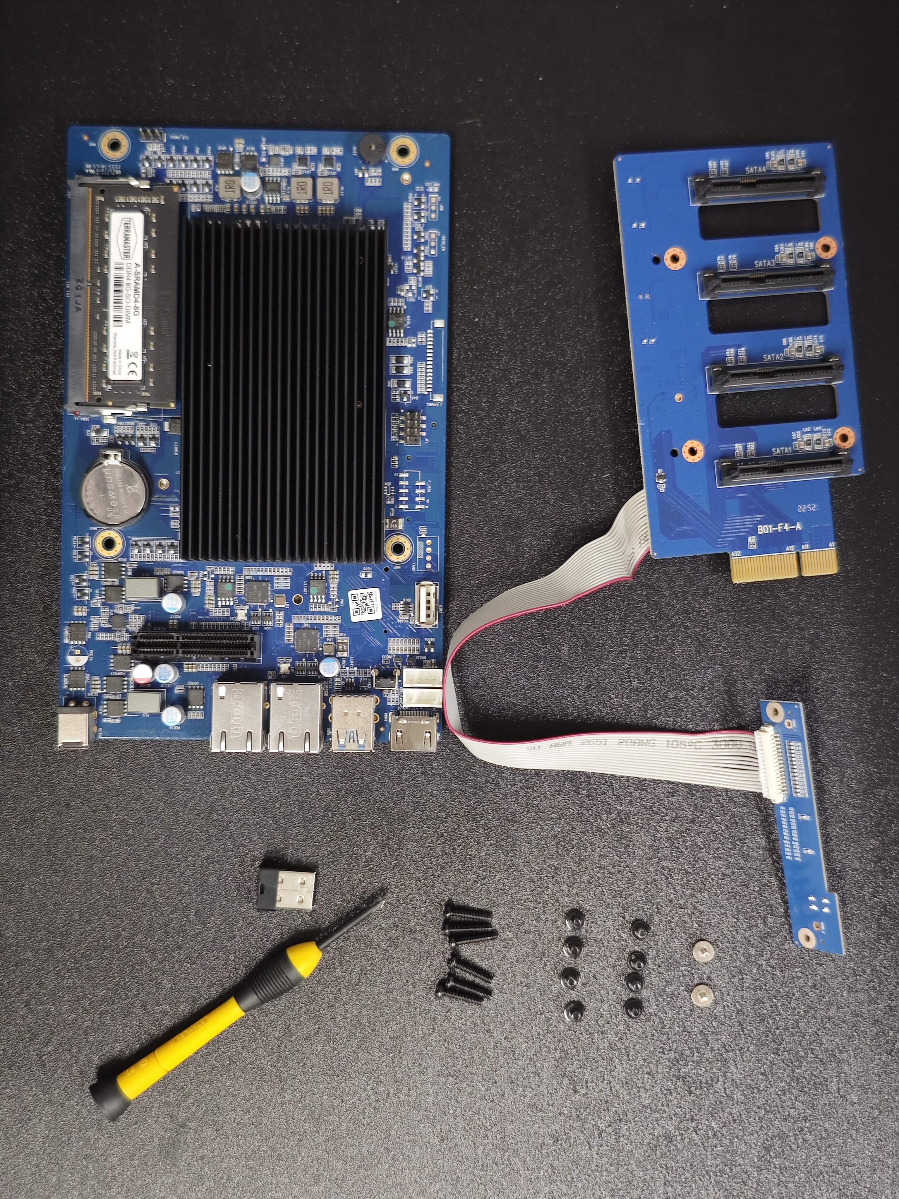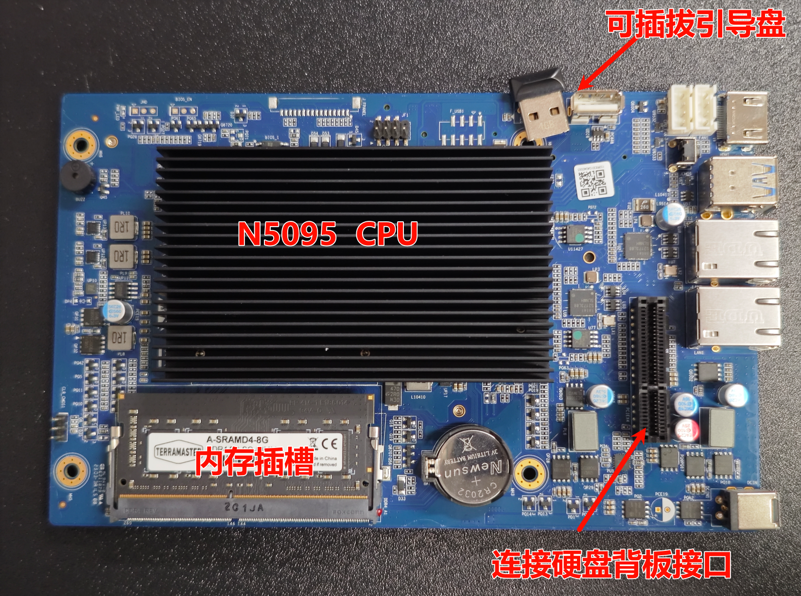 3、拆下主板,主板右上方有一个usb接口,插入的U盘为TOS的引导盘,中间位置是英特尔低功耗四核四线程N5095CPU,采用了被动散热,借助于NAS后面的两个8CM风扇散热,最下方有一个DDR4笔记本内存插槽,右下方为主板连接硬盘背板的PCI接口。