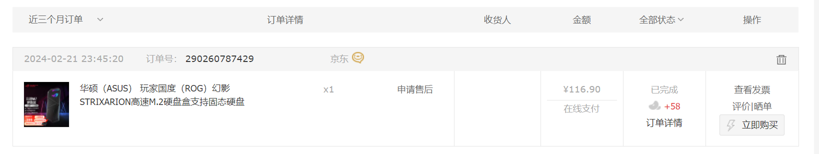 最近京东有了点京豆,不知道买点啥,索性还是买男人宝贝吧,一款关注很久的硬盘盒,华硕ROG硬盘盒,京东目前399元,好评送口罩(没啥卵用)用上京豆到手116元,以下简单开个箱子。