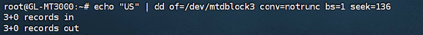 echo "US" | dd of=/dev/mtdblock3 conv=notrunc bs=1 seek=136 ##注意修改分区信息mtdblock3