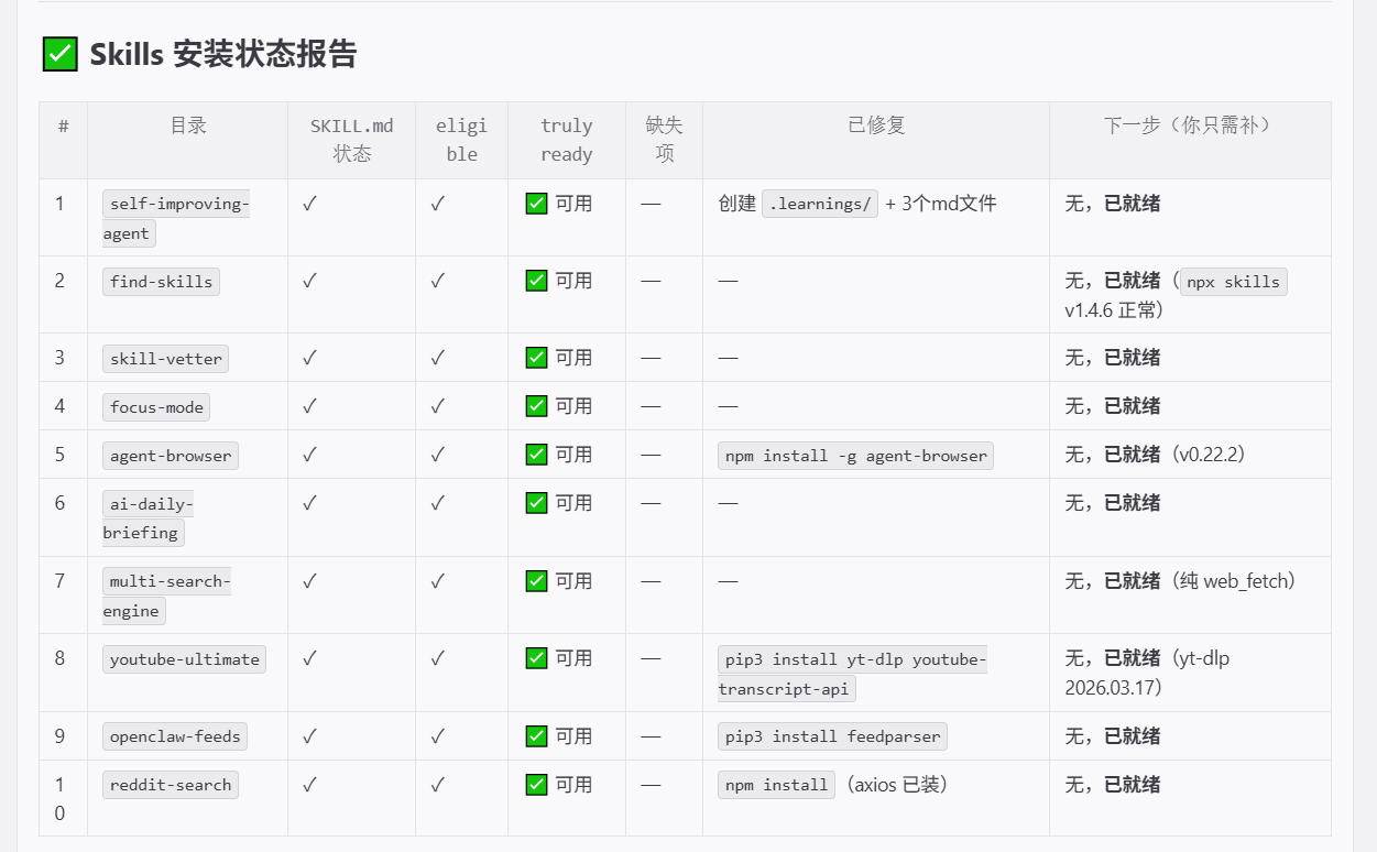 可用/待密钥/依赖问题/部分可用/不符/跳过,并逐项写目录、SKILL.md、eligible、truly ready、缺失项、已修复、下一步我只需补什么。